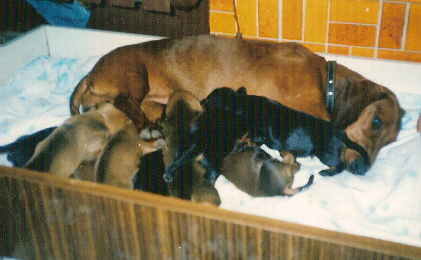 W 1985r. GIAURA pokryta SUŁTANEM Tristan (DEVIL v.d.Erle x KAMELIA Pacyfik) urodziła 4 szczenięta, które okazały się być jej najlepszym miotem w życiu hodowlanym. Dwa prześliczne psy CELIX i CENZUS trafiły do osób, których niestety nie interesowały wystawy. Tego samego roku do hodowli przybyła pręgowana ERATO ELBA Pacyfik. Z suczką tą wiązałam duże nadzieje, które z biegiem czasu okazały się zbyt wyolbrzymione, bo ERATO, choć wyrosła na ładną suczkę, to nie miała dużych osiągnięć wystawowych. Jako suka hodowlana też nie urzeczywistniła mych oczekiwań, gdyż miała problemy z płodnością.